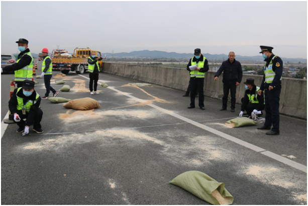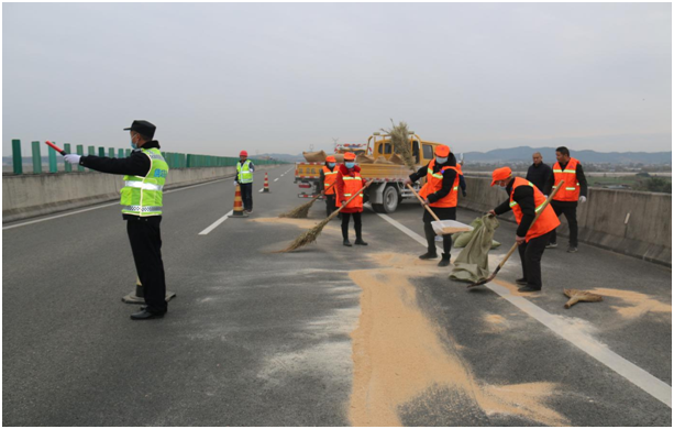 此次演練模擬場景為:涪江特大橋上一貨車發(fā)生單車事故,車上貨物傾撒,造成環(huán)境污染,道路堵塞。接到報警后,應(yīng)急處置演練領(lǐng)導(dǎo)小組立即啟動應(yīng)急預(yù)案,高速交警、交通執(zhí)法、路產(chǎn)維護(hù)、安宏救援、綿陽路橋等相關(guān)人員迅速集結(jié)趕赴事發(fā)地展開搶險救援,同時執(zhí)行公路斷道告知、實施交通管制、清理污染物、積極搶通道路恢復(fù)交通等應(yīng)急措施,快速消除了安全隱患,保障了道路暢通。