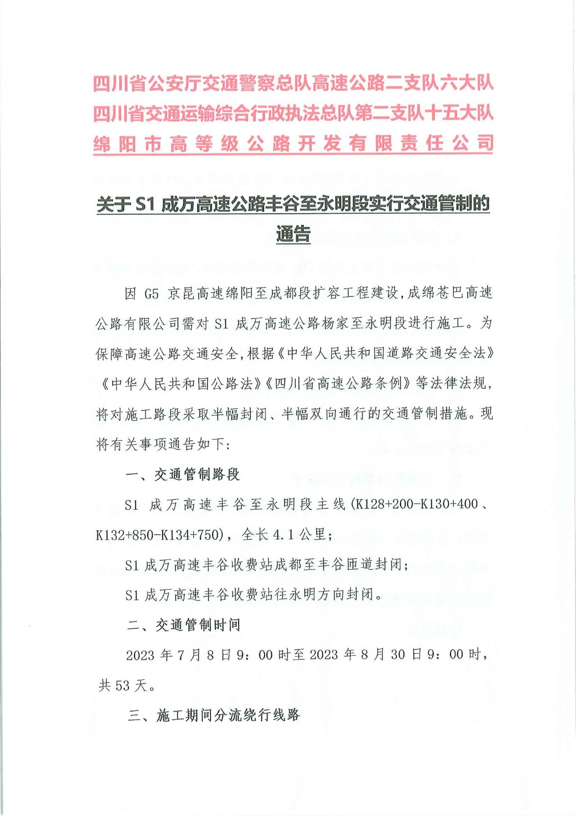 關(guān)于S1成萬(wàn)高速公路豐谷至永明段實(shí)行交通管制的通告