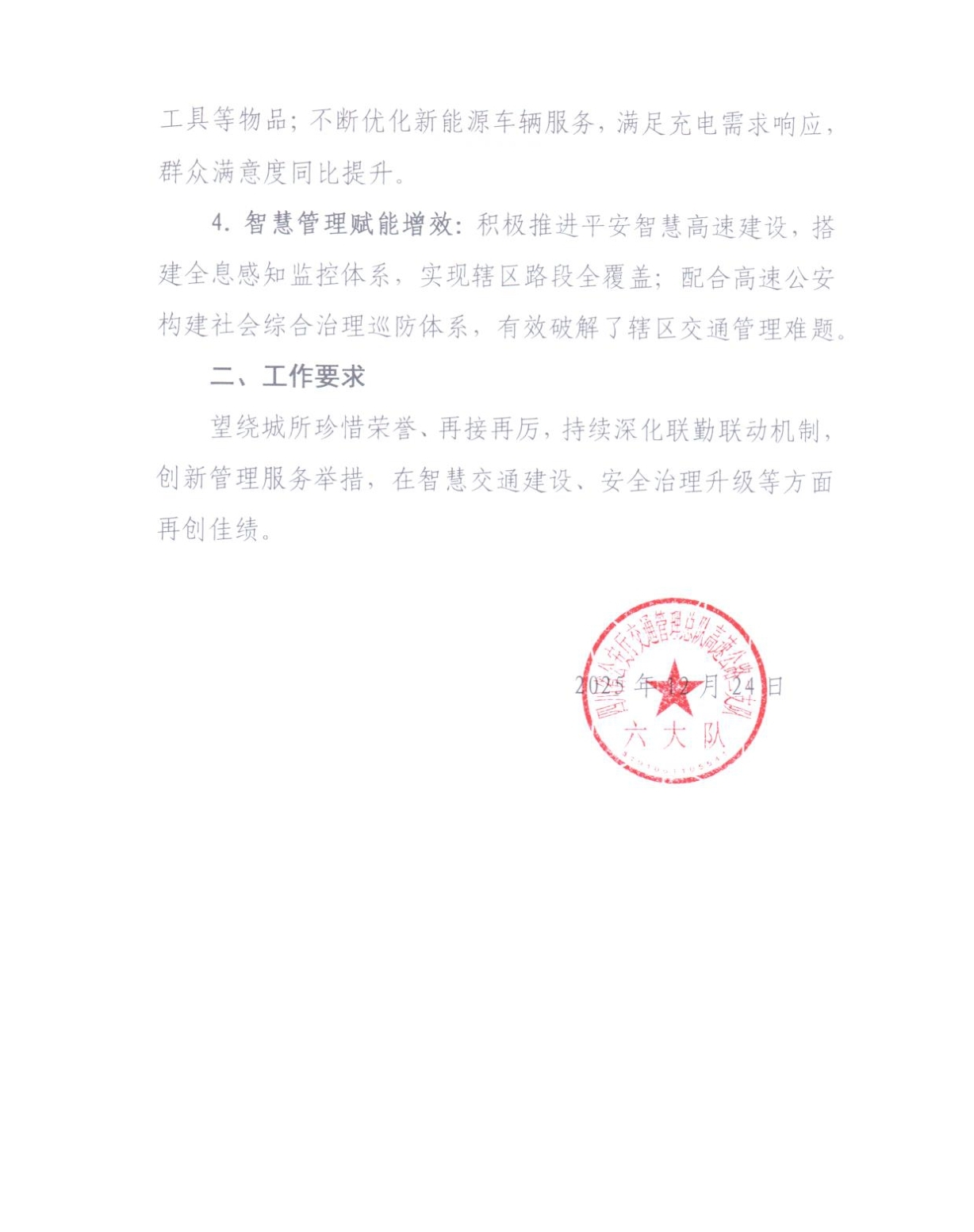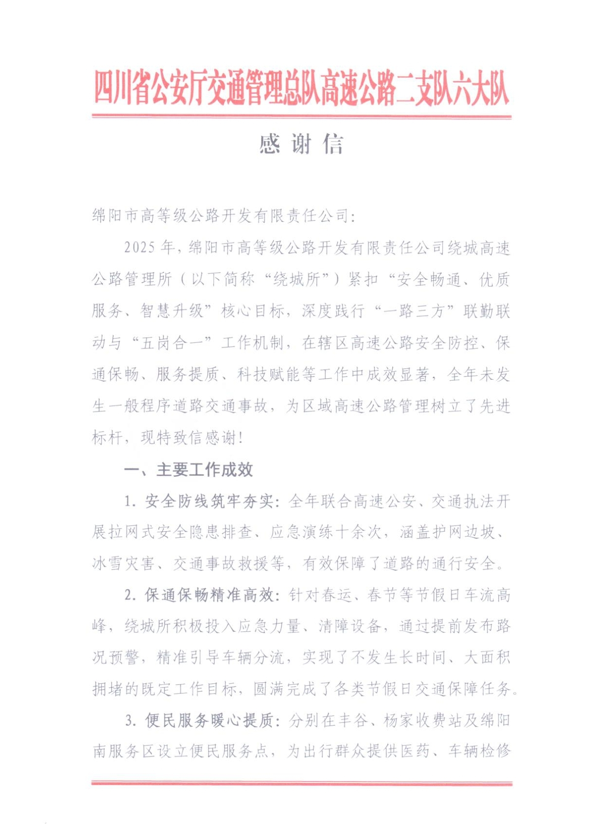 1月15日,高開司收到來自四川省公安廳交通管理總隊(duì)高速公路二支隊(duì)六大隊(duì)的一封感謝信。信中對(duì)高開司繞城高速2025年度“安全暢通、優(yōu)質(zhì)服務(wù)、智慧升級(jí)”核心目標(biāo),深度踐行“一路三方”聯(lián)勤聯(lián)動(dòng)與“五崗合一”工作機(jī)制,在轄區(qū)高速公路安全防控、保通保暢、服務(wù)提質(zhì)、科技賦能等工作中成效顯著,全年未發(fā)生一般程序道路交通事故,為區(qū)域高速公路管理樹立了先進(jìn)標(biāo)桿,給予高度贊譽(yù),對(duì)公司與高速公安攜手筑牢道路安全防線、全力保障公眾出行順暢的堅(jiān)實(shí)舉措表達(dá)誠摯謝意,字里行間滿含認(rèn)可與期許。