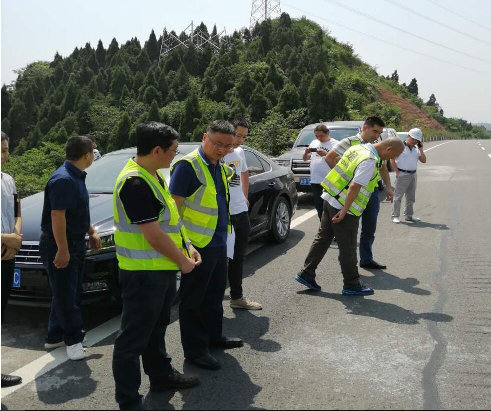 為了推進綿陽繞城高速公路竣工驗收順利進行,2019年6月4日上午,交發(fā)集團蒲紅旗總經(jīng)理、陳劍總工程師率隊赴綿陽繞城高速公路現(xiàn)場,督查橋梁及路面病害處置情況。在涪江特大橋樁基施工現(xiàn)場,施工單位對工程的進展情況進行了匯報,綿陽川交設計院對新增病害的處置方案進行了說明。蒲總經(jīng)理強調,要加快工程進度,確保工程質量,保證施工安全,快速高效的推進病害處置,確保竣工驗收順利推進。